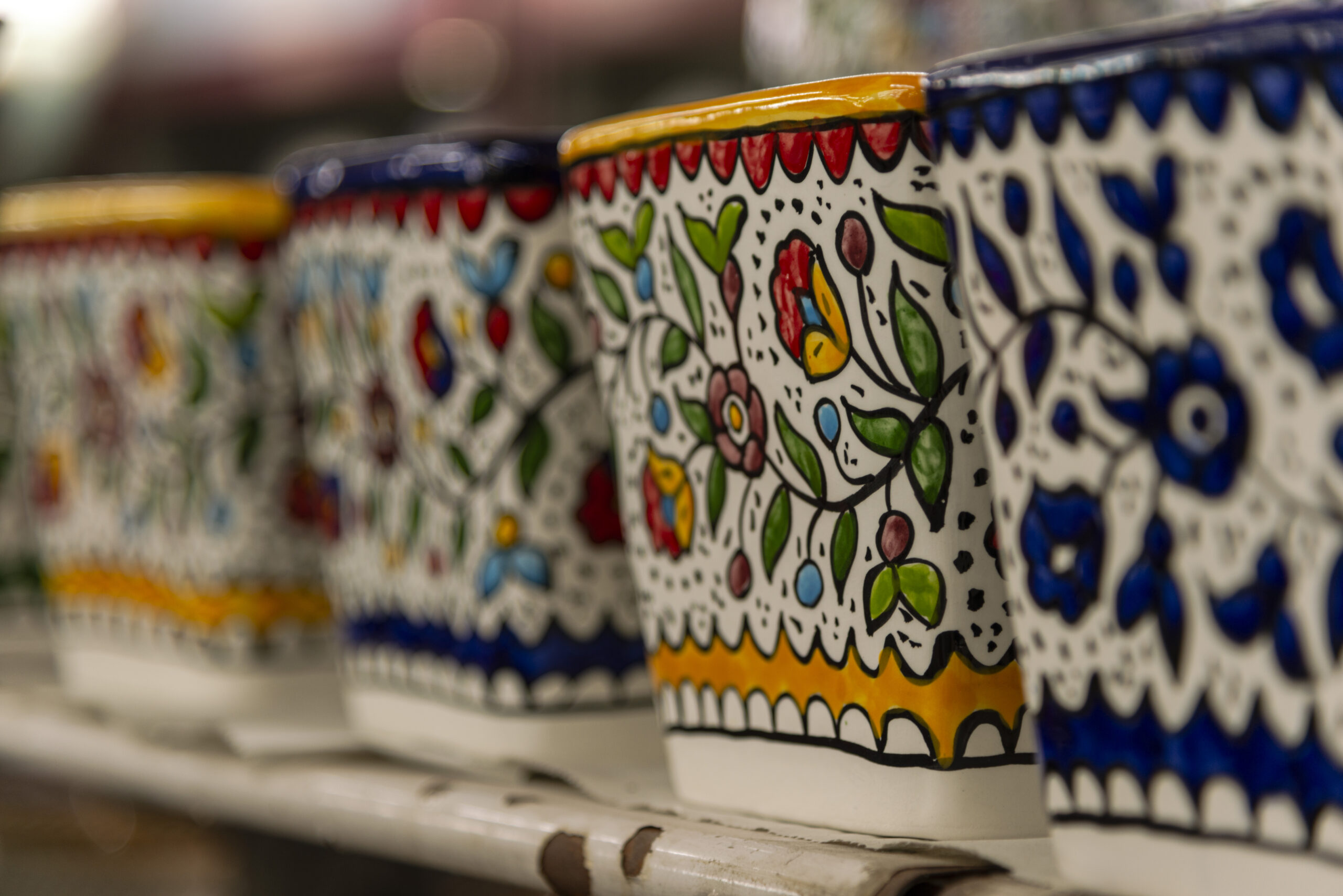 Along with the Kufiyah factory are many workshops for glassmaking, ceramics, terracotta. Hebron, in spite of everything, is still an important economic center, a symbol of Palestinian resistance and resilience to a violent colonization project that penetrates the city streets, the houses and impedes people’s freedom of movement by means of roadblocks and checkpoints.